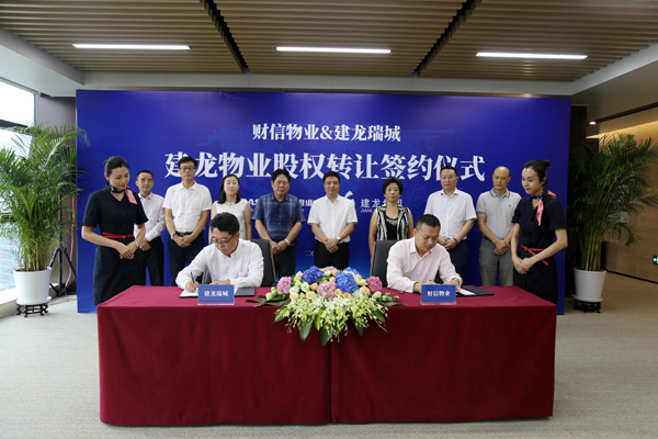 | 2017年9月15日下午,在財信集團總部,建龍集團瑞城房地產(chǎn)與重慶財信物業(yè)就建龍物業(yè)股權轉讓簽署了合作協(xié)議。 |
