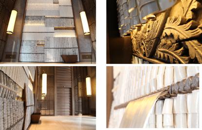 | 入口/大堂 對稱的格局打造出穩定的氣勢與中道的理念,格柵與屏風的元素貫穿始終,展現麗晶當代中國的品牌元素。進入酒店,映入眼簾的即是高約兩層樓、由設計師蔡文卿(Eric Tsay),邀請景德鎮陶藝家共同創作的「山城意向」陶瓷藝術墻。 透過自動開啟與閉合的玄關木門,將客人帶入酒店大堂,窗欞式的層層屏風將酒店的各個功能區做了恰到好處的隔斷。屏風中間鑲嵌景泰藍勾金的山茶花圖案,將重慶市花—山茶花巧妙融入。 禮賓臺左側的大幅幕墻由金色與白色瓷片鑲嵌成連綿起伏的群山畫面,映襯著山水重慶的蓬勃氣勢與靈秀。大堂接待臺四周的墻面由席面作漆,用現代的方式呈現古老的席面工藝。下方墻面由金磚鋪設,并在磚面中加入方形金飾圖騰,更顯大氣沉穩。 |