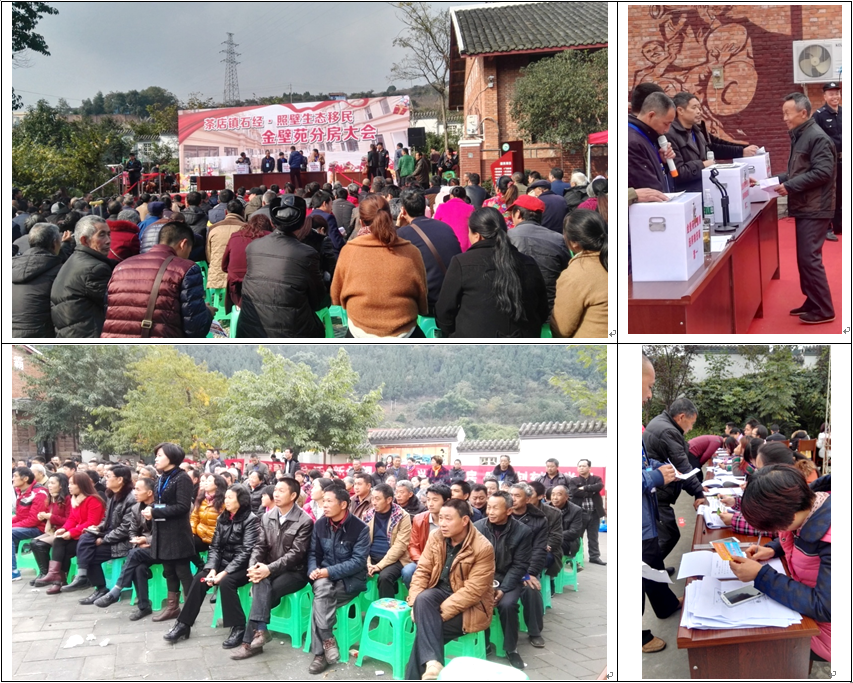 2015年11月30日起,三天的時間,1147戶村民在鎮領導及渝成財信派駐人員的鑒定、監督下,村民按抽簽順序依次上臺抽房,臺上設置3個箱子分別是套一、套二及套三住房,將在3136套住房中抽取2266套住房,抽取完后將在相關工作人員處進行公正登記。