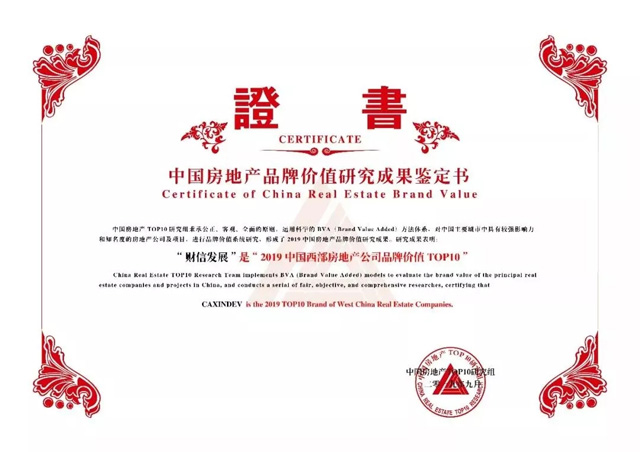 財信發展榮膺”2019中國西部房地產公司品牌價值TOP10”稱號