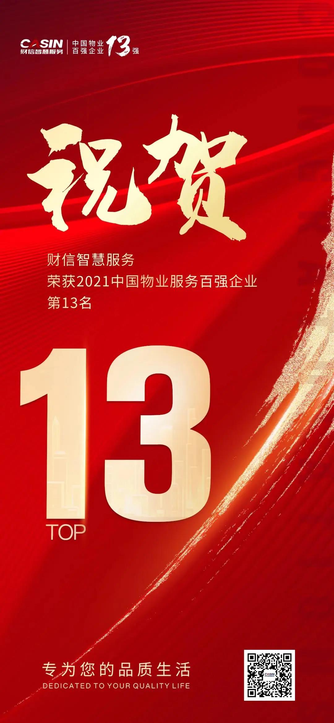 4月22日,由中國指數研究院、中國房地產TOP10研究組聯合主辦的"2021中國物業服務百強企業研究成果發布會暨第十四屆中國物業服務百強企業家峰會"在北京召開。財信智慧生活服務集團憑借優異的市場表現,榮膺"2021中國物業服務百強企業第13名"稱號。