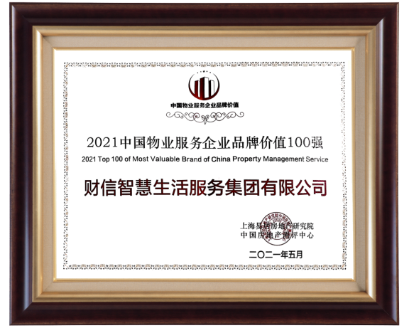 品牌價(jià)值凸顯!財(cái)信智慧服務(wù)榮膺2021中國(guó)物業(yè)服務(wù)企業(yè)品牌價(jià)值100強(qiáng)